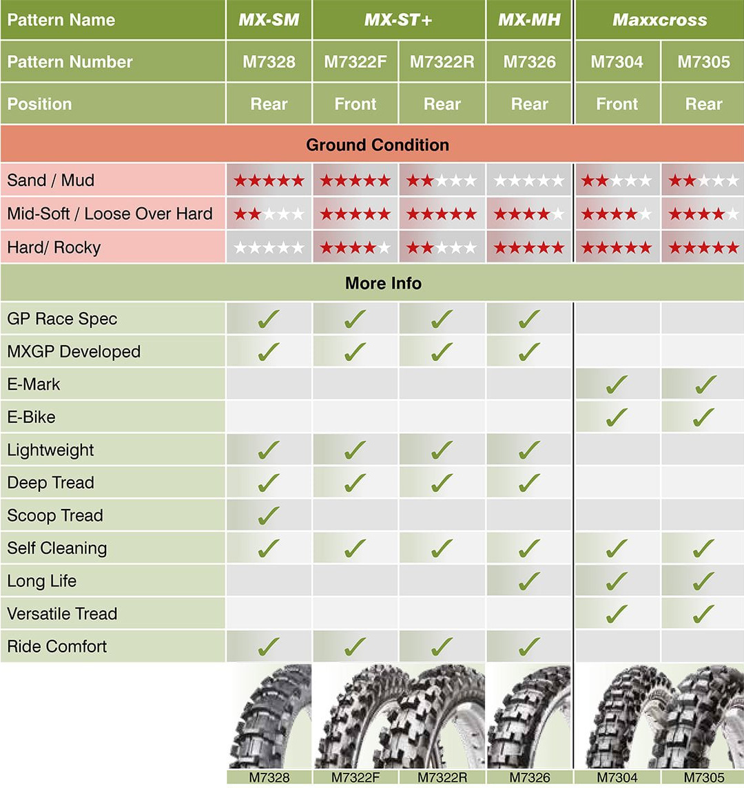 The Maxxis MXGP race winning family comprises of 4 tyres for every ground condition, the MX-ST+ front excels with every rear, the MX-SM for sand and mud, the MX-ST+ for soft-intermediate to semi- hard and the new MX-MH for hard conditions. Supporting the GP range is the legendary Maxxcross range for a truly inspiring clubman tyre.